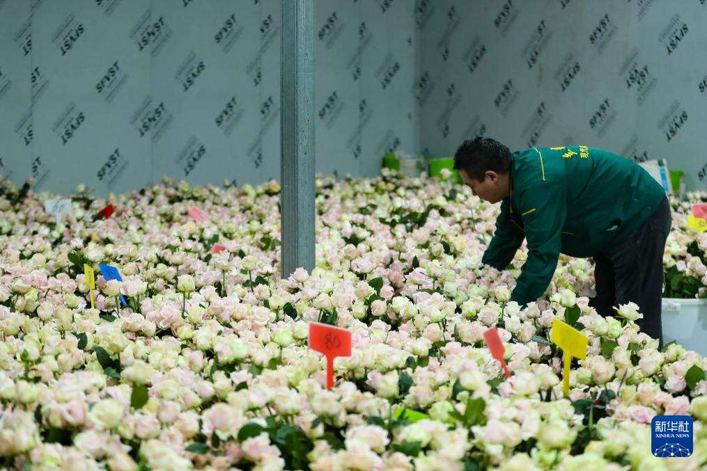 工人在兰州新区现代农业示范园花卉产业基地的冷库内摆放鲜花(11月6日摄)。