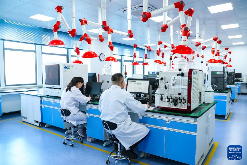 11月7日,在兰州新区化工园区,一家化工企业的工作人员在精密仪器室内工作。