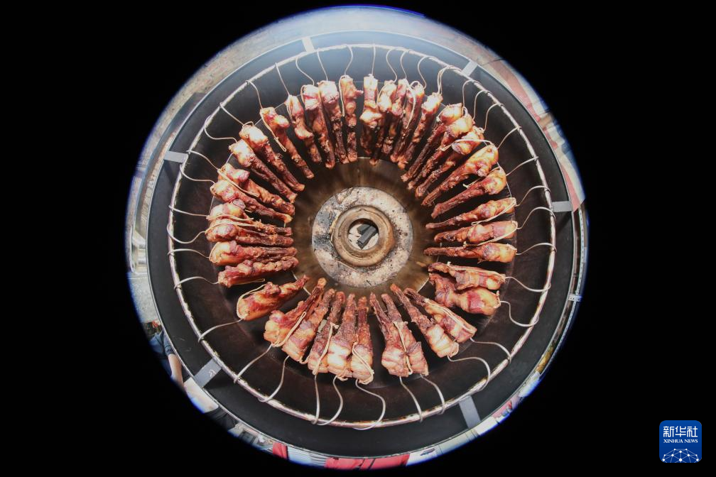 11月7日,在三江侗族自治县丹洲镇丹洲村,侗族群众在用烤炉制作腊肉。
