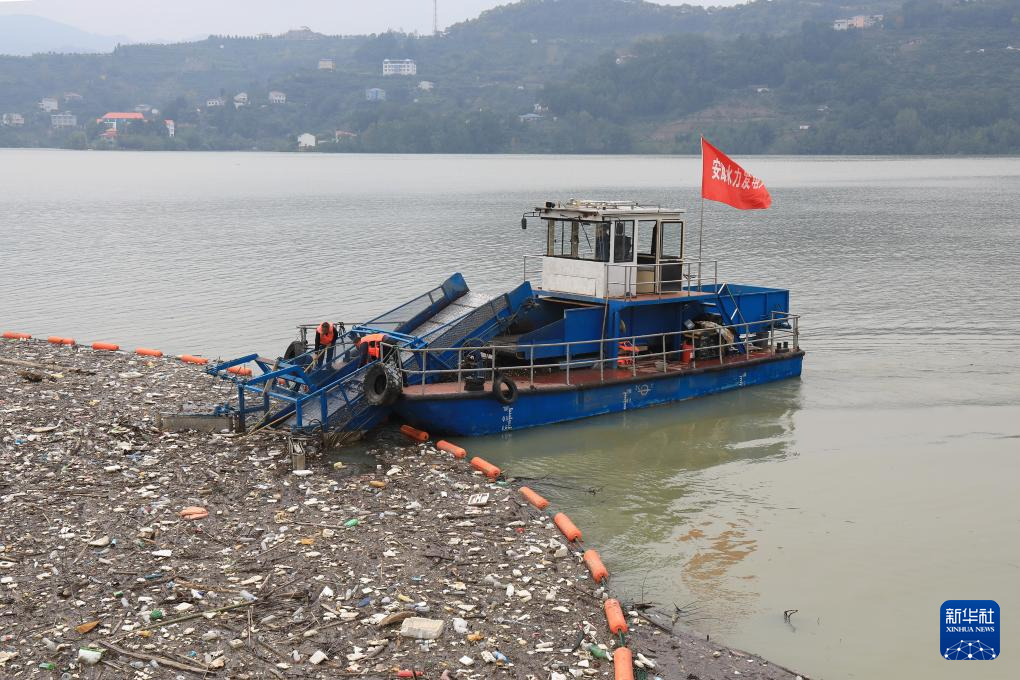 位于安康市汉滨区的汉江瀛湖库区,一搜打捞船在清理山洪过后产生的漂浮物(2023年10月12日摄)。