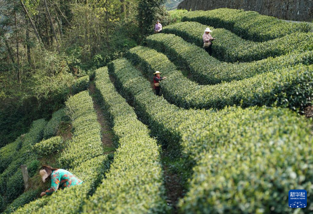 茶农在安康市汉滨区双龙镇一处茶山上采茶(3月27日摄)。