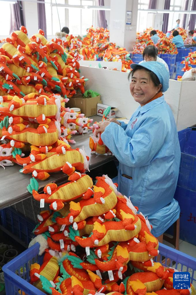 工人在安康市汉滨区一家毛绒玩具生产企业车间内加工龙年生肖主题毛绒玩具(2月19日摄)。