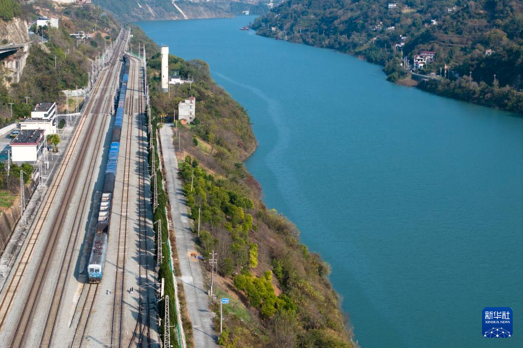 安康市旬阳市段家河镇内的襄渝铁路和汉江(2023年11月21日摄,无人机照片)。