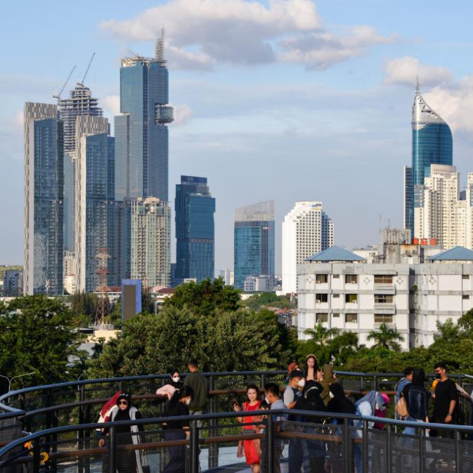 2022年1月23日,人们在印度尼西亚雅加达史纳延公园的空中步道欣赏城市风光。