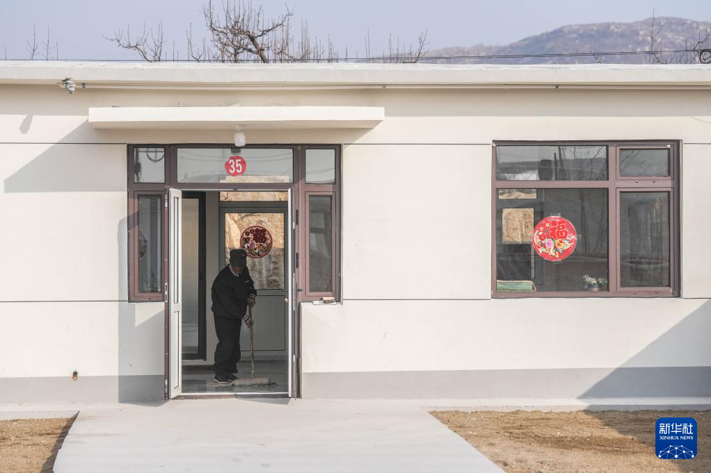 11月8日,辽宁省葫芦岛市绥中县祝家沟村村民在集中安置重建住房清扫屋子。
