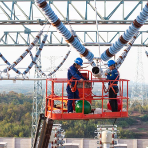 11月8日,在位于衡南县泉湖镇的衡阳换流站,电力工人在安装绝缘球(无人机照片)。