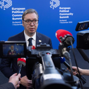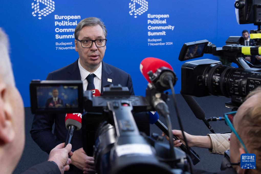 11月7日,在匈牙利布达佩斯,出席第五届欧洲政治共同体领导人会议的塞尔维亚总统武契奇接受媒体采访。