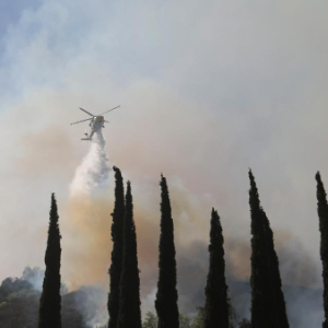 11月7日,一架消防直升机在美国加利福尼亚州文图拉县穆尔帕克市附近的乡村地区洒水灭火。