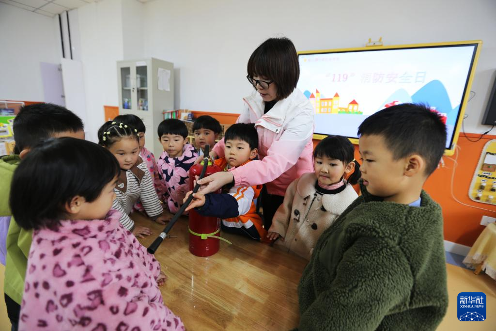 11月8日,甘肃省定西市安定区实验幼儿园的老师引导小朋友认识灭火器。