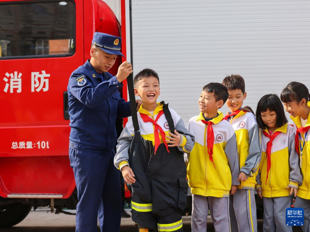 11月8日,消防员在贵州省铜仁市玉屏侗族自治县印山民族小学指导学生体验穿消防服。