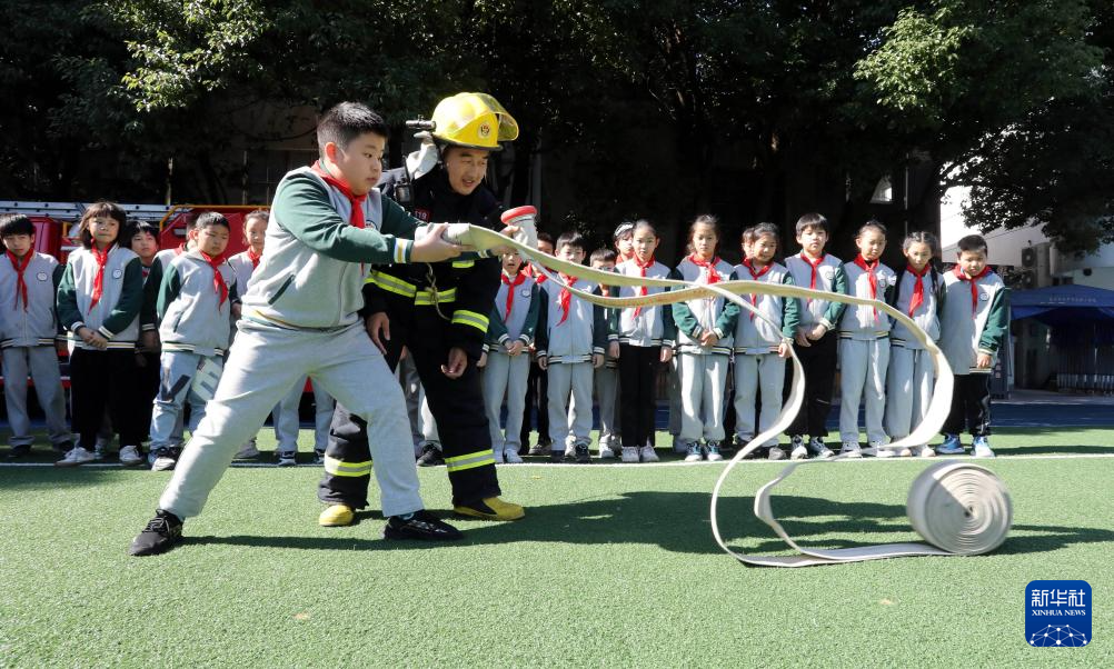 11月8日,江苏省苏州市东中市实验小学的学生在消防救援队员指导下体验使用消防设备。