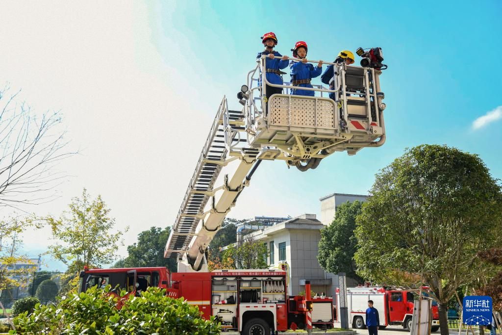 11月8日,浙江省金华市仙源湖实验学校,消防员带着学生体验登高车平台。