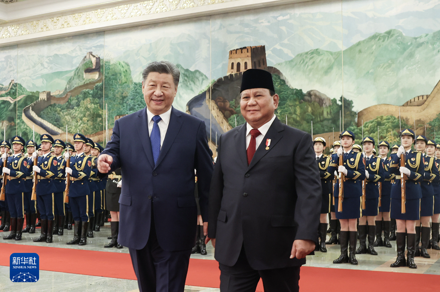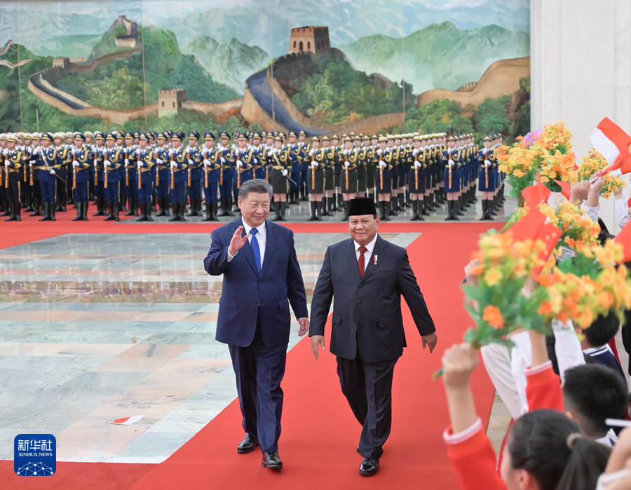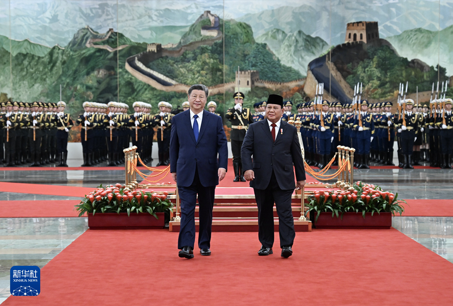 11月9日下午,国家主席习近平在北京人民大会堂同来华进行国事访问的印度尼西亚总统普拉博沃举行会谈。这是会谈前,习近平在人民大会堂北大厅为普拉博沃举行欢迎仪式。