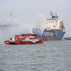 11月9日,应急救援力量在演习中拖带船只。