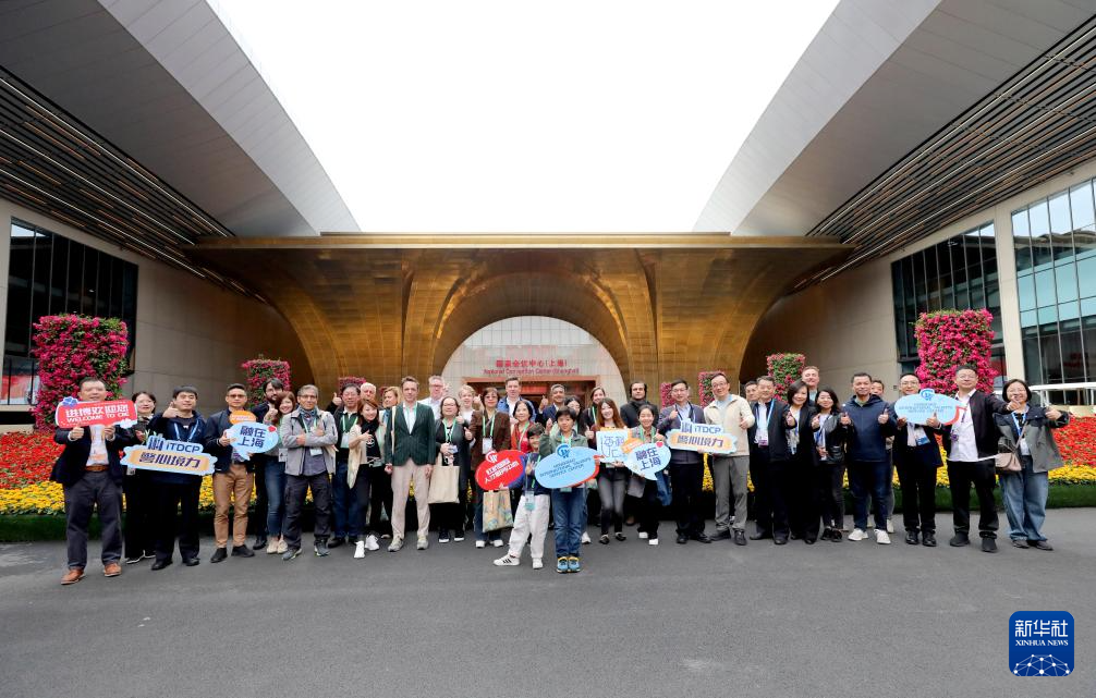 11月9日,“外籍人才看进博”活动团成员在虹桥国际经济论坛举办地国家会议中心(上海)外合影。