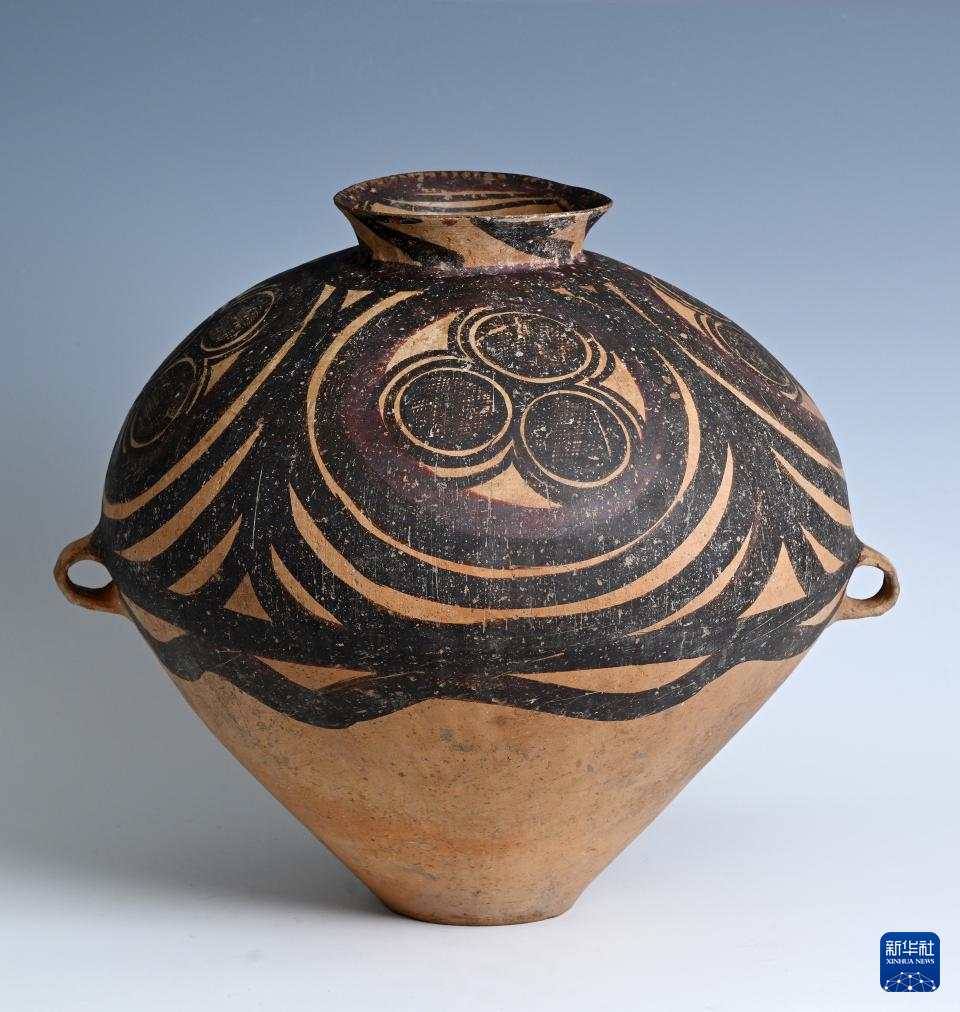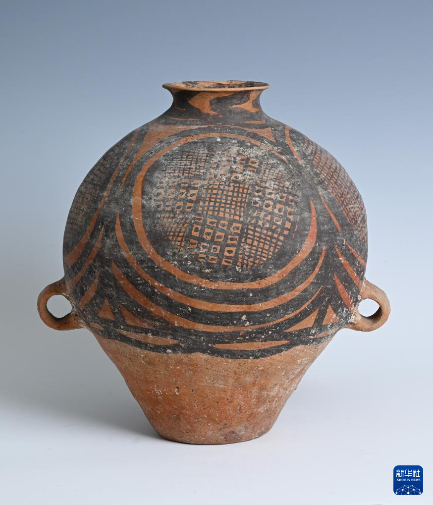 四大圆圈网格纹双耳彩陶壶(11月5日摄)。
