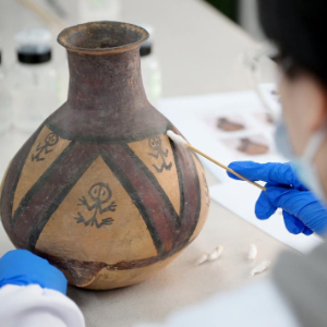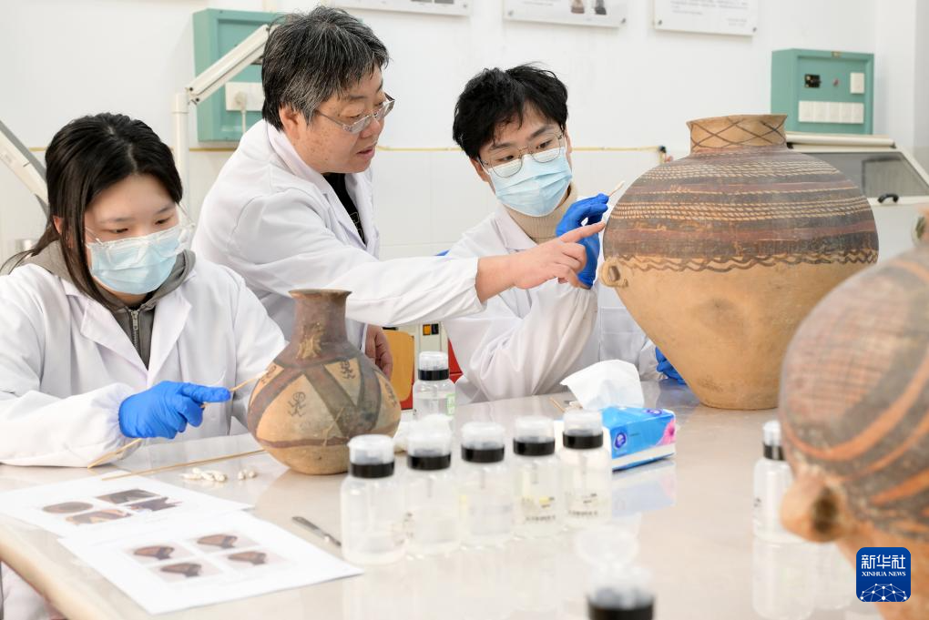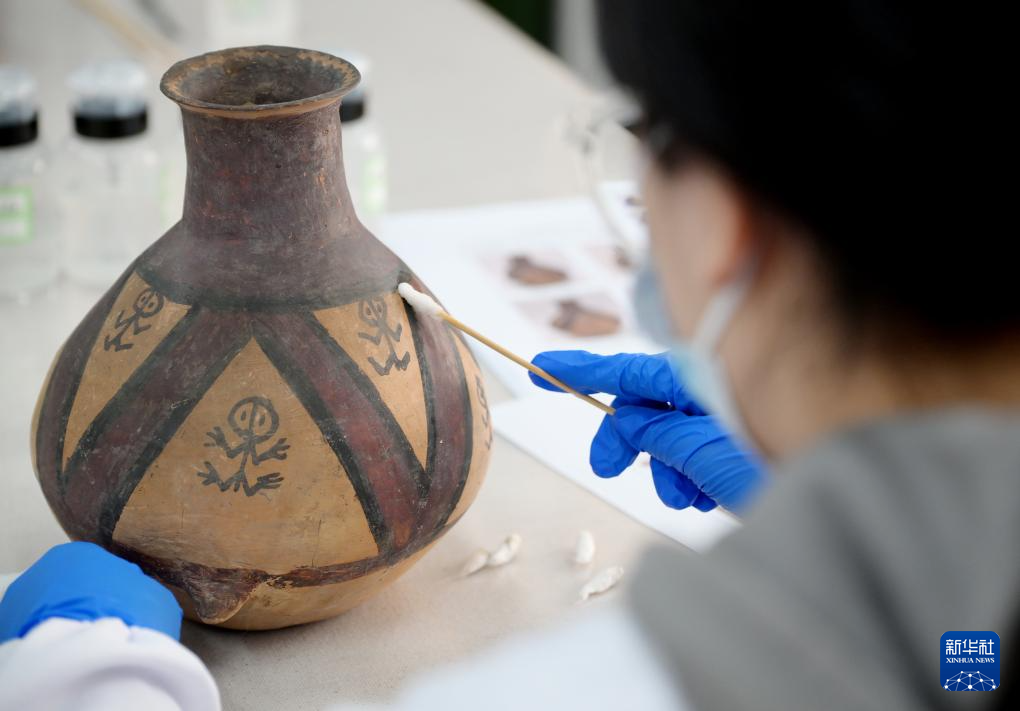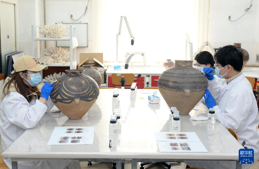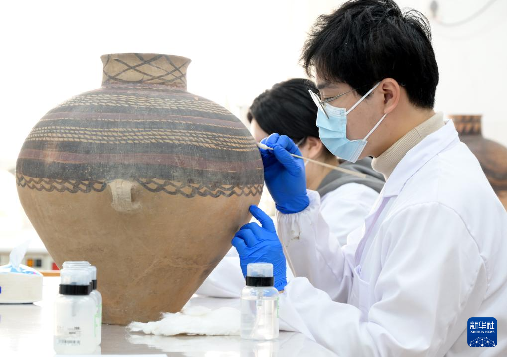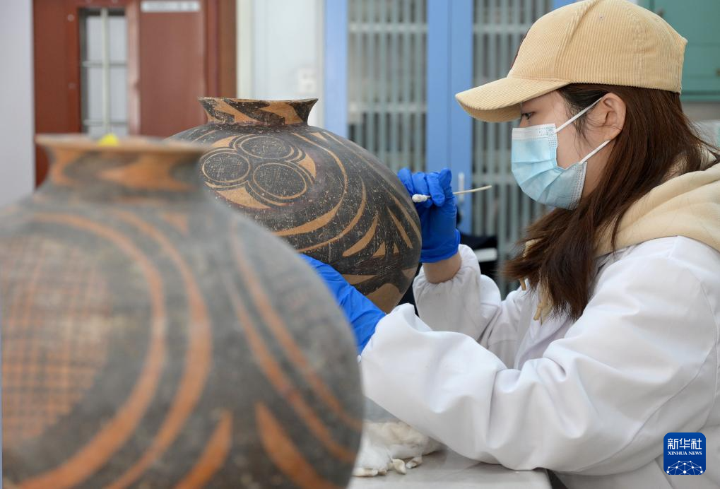 11月5日,在中国文化遗产研究院陶瓷金属文物修复室内,专业技术人员在对彩陶文物进行修复。