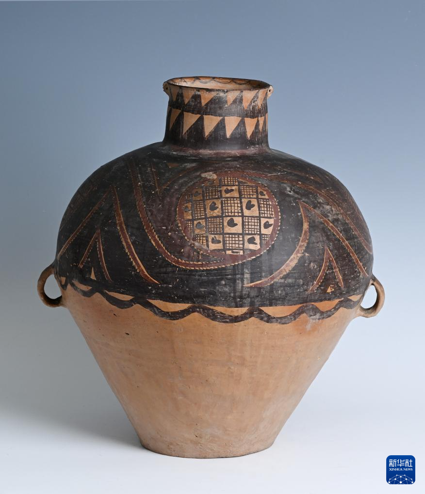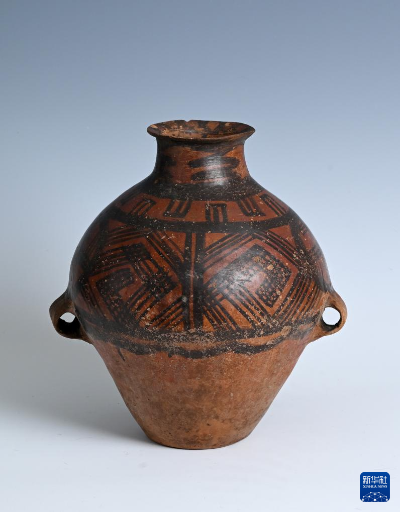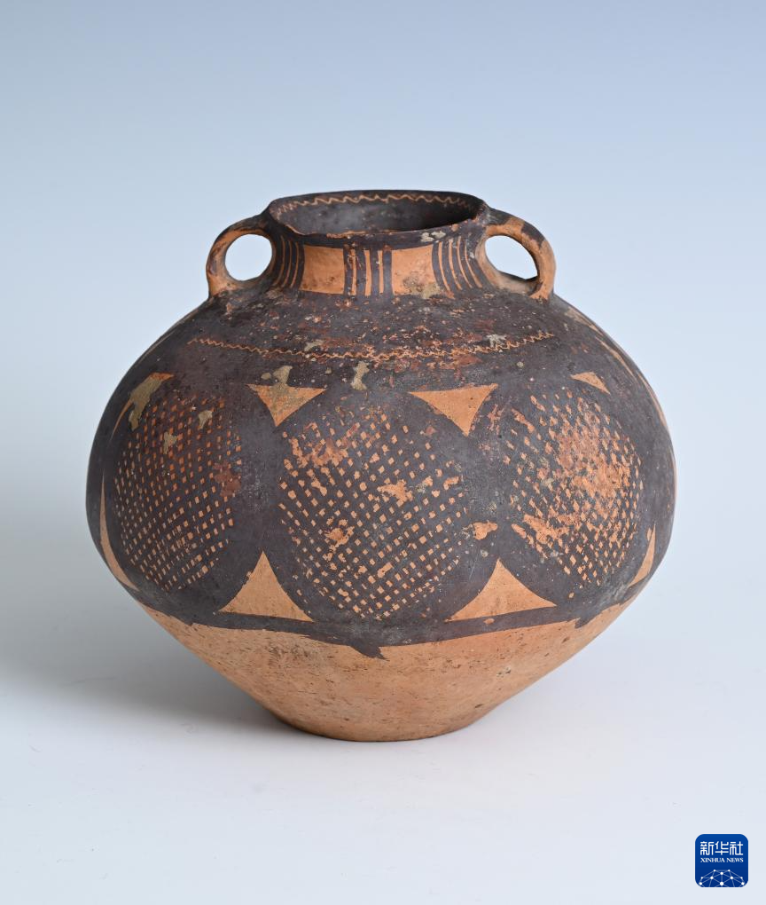 旋涡方格网纹双耳彩陶壶(11月5日摄)。