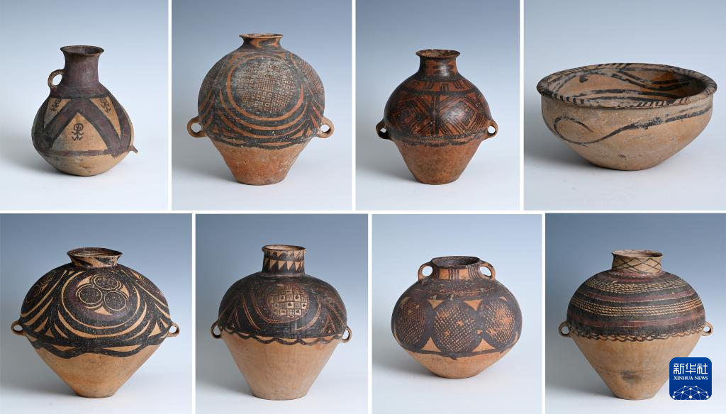 意大利返还中国的新石器时代马家窑彩陶器(11月5日摄,拼版照片)。