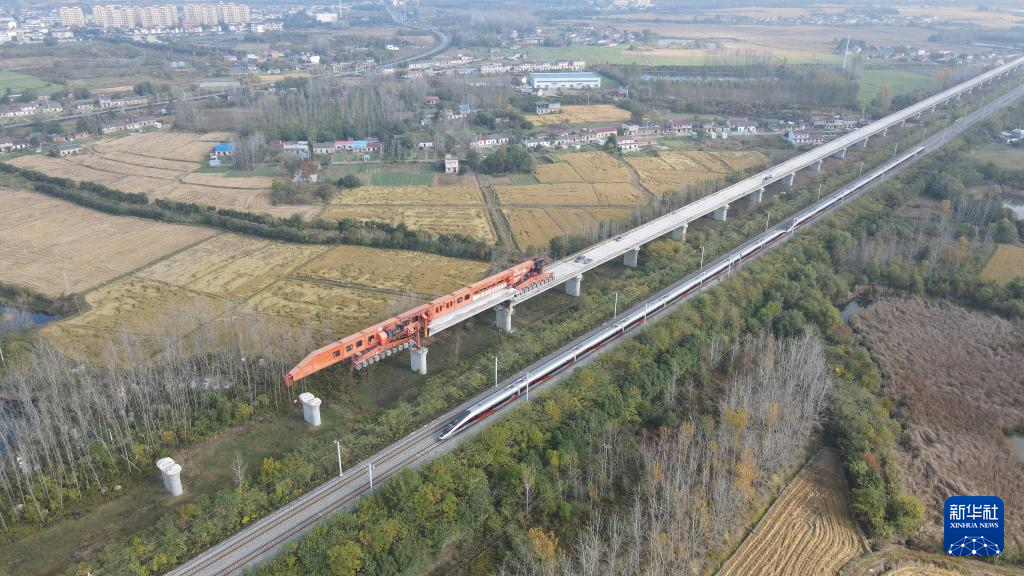 这是中国铁建大桥局新建沪宁合高铁箱梁架设现场(11月10日摄,无人机照片)。