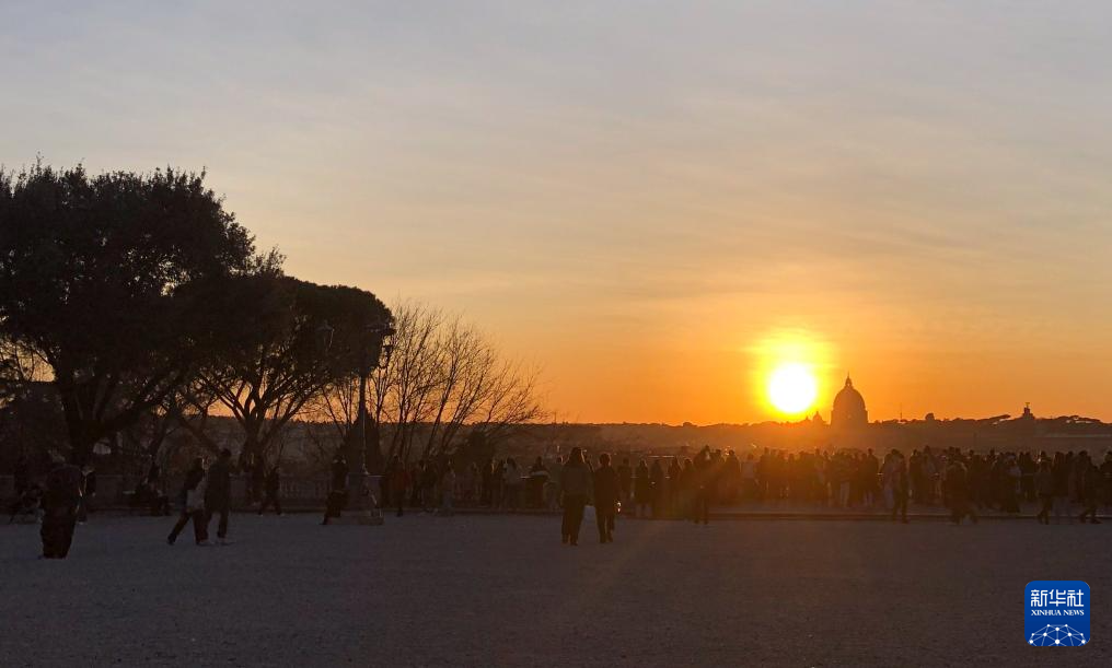 2024年1月23日,游客在意大利罗马的博尔盖塞公园观看落日(手机照片)。
