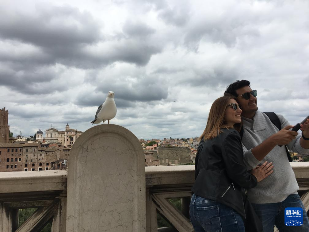 2019年5月21日,两名游客在意大利罗马与海鸥自拍(手机照片)。