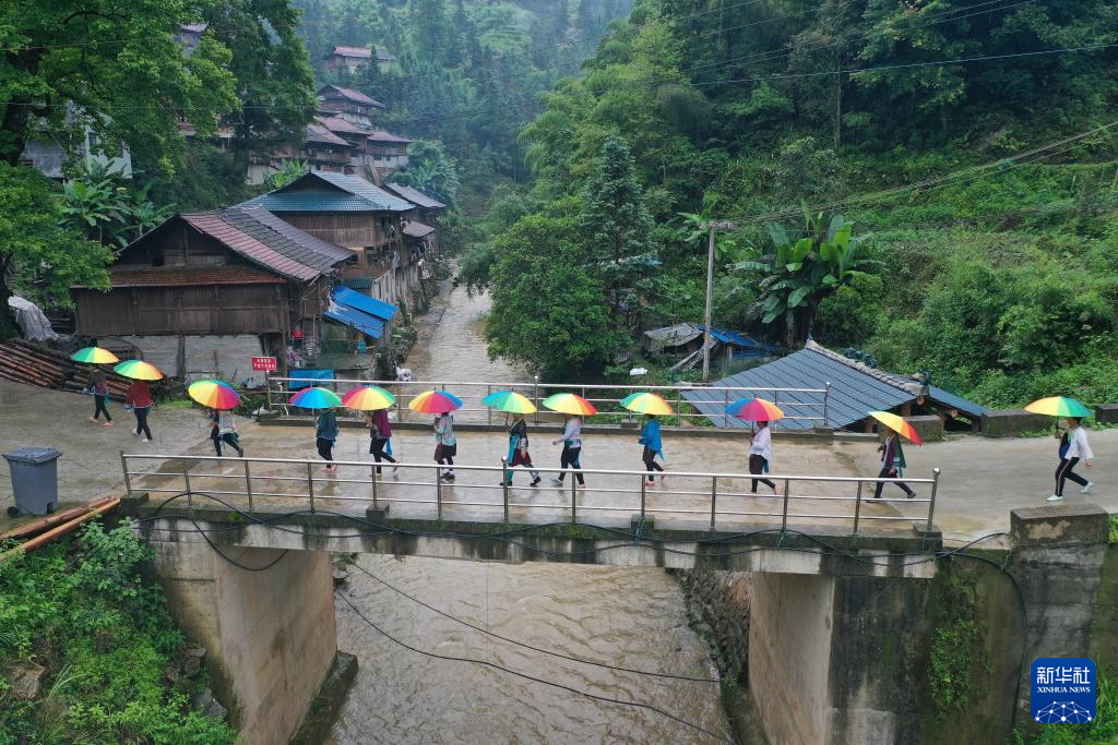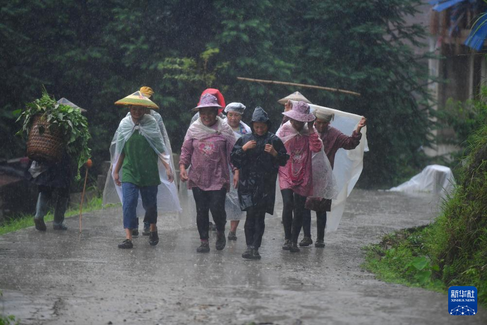 在乌英苗寨,妇女们冒雨去参加集体劳动(2019年7月6日摄)。