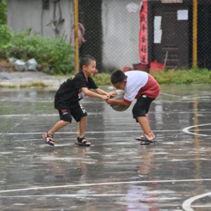 乌英苗寨的孩子们在雨中打篮球(2023年8月2日摄)。