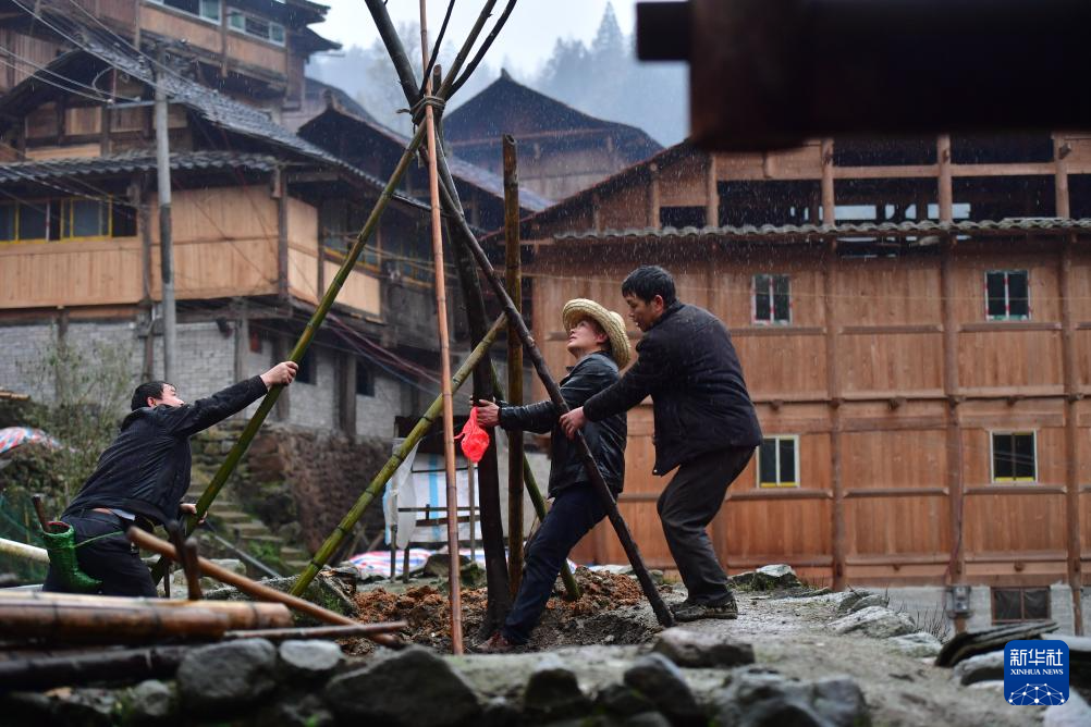 乌英苗寨村民在雨中搬运木材,准备建新木楼(2018年5月9日摄)。