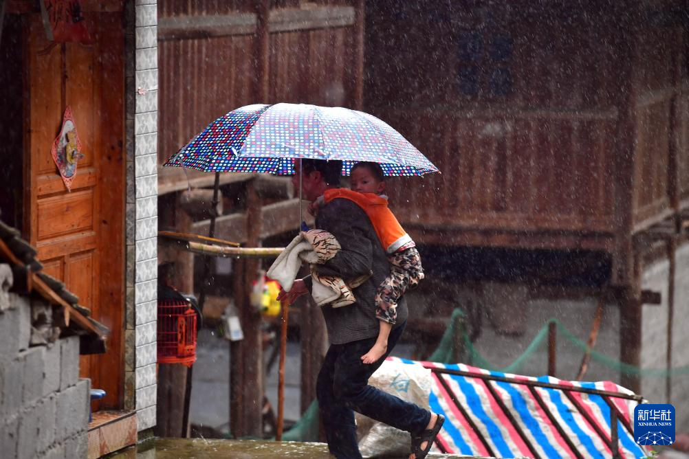 乌英苗寨村民吴新仁在雨中背着儿子回家(2018年6月4日摄)。