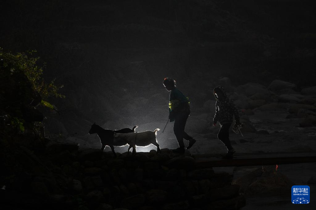 乌英苗寨村民在细雨中劳作归来(2017年11月11日摄)。