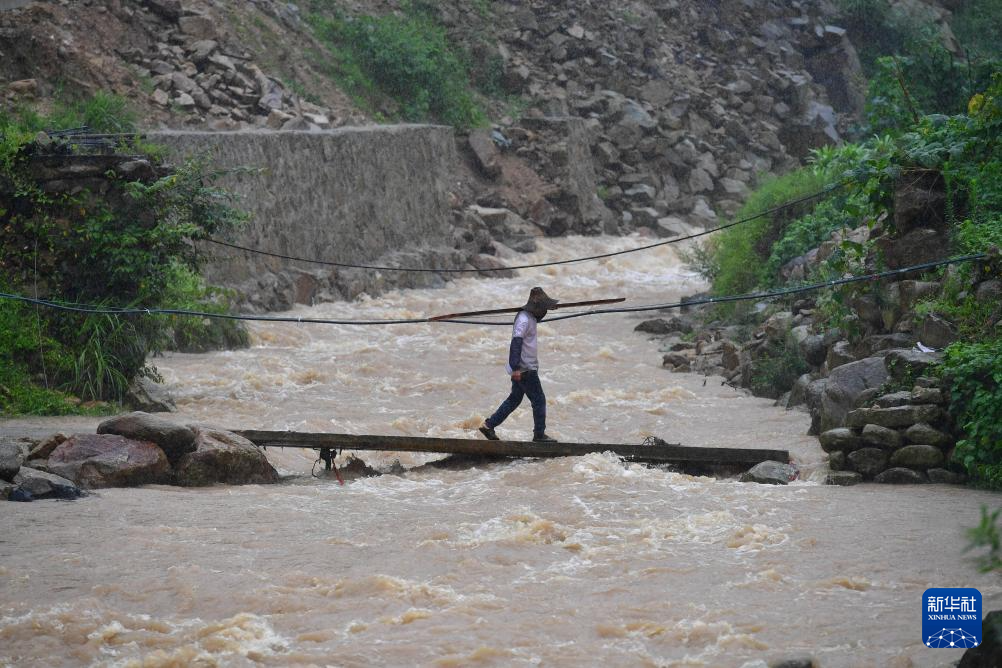 在乌英苗寨,村民梁秀前冒雨为新建公共木楼搬运木材(2019年7月6日摄)。