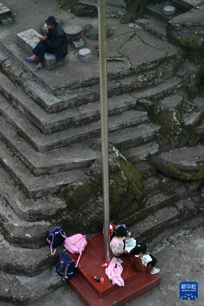 下午放学后,乌英苗寨教学点的孩子们在旗台上看书(2024年11月7日摄)。
