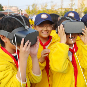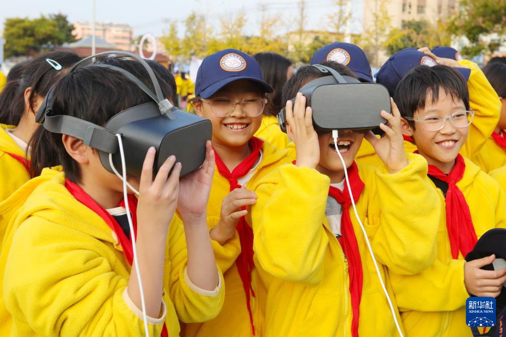 11月11日,安徽省淮北市首府实验小学的小学生体验VR设备。