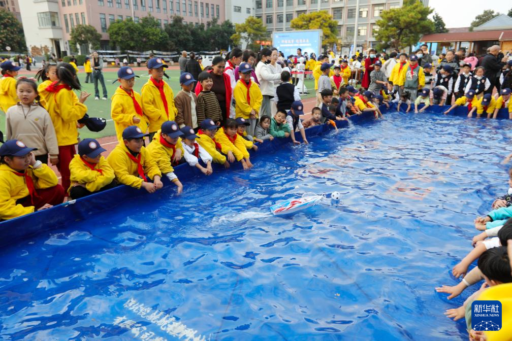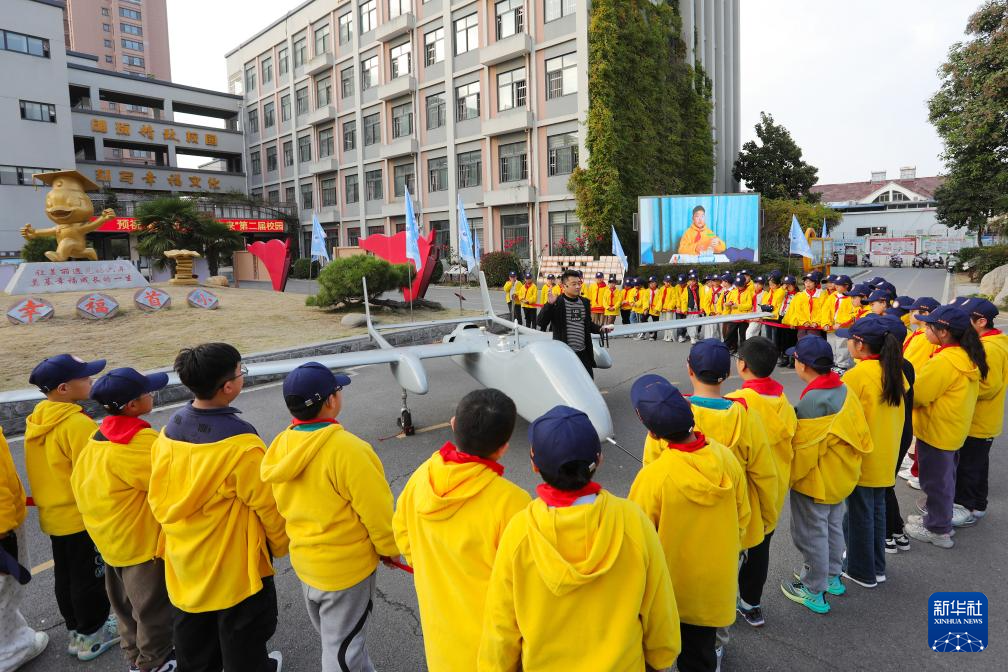 11月11日,安徽省淮北市首府实验小学的小学生在观看航模演示。