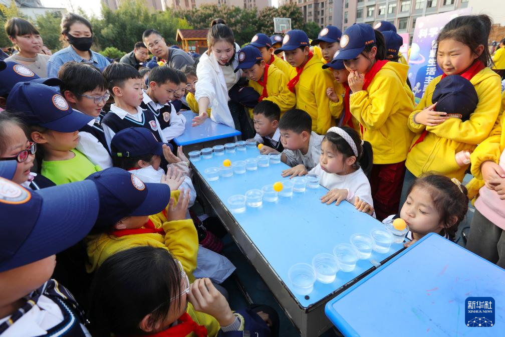 11月11日,安徽省淮北市首府实验小学的小学生参加趣味科学实验。