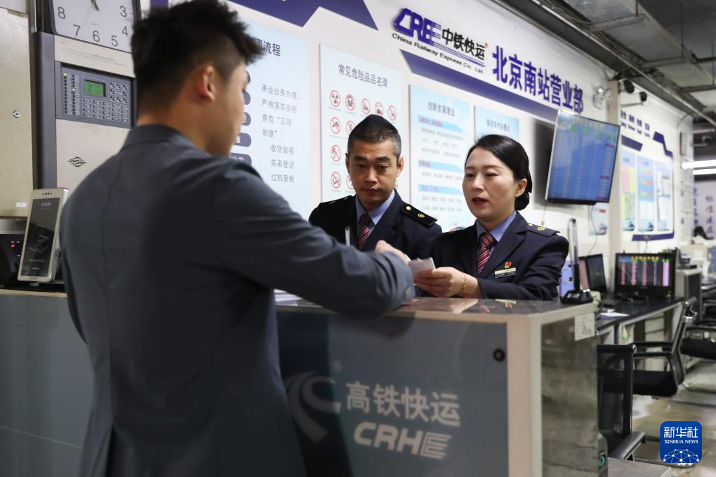 11月11日,工作人员在中铁快运北京南站营业部为客户办理业务。