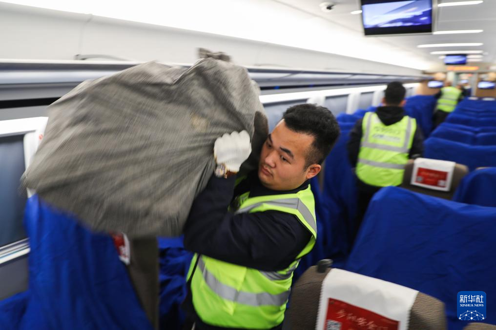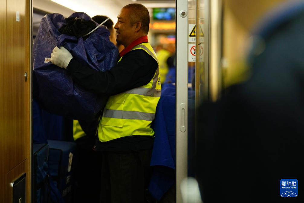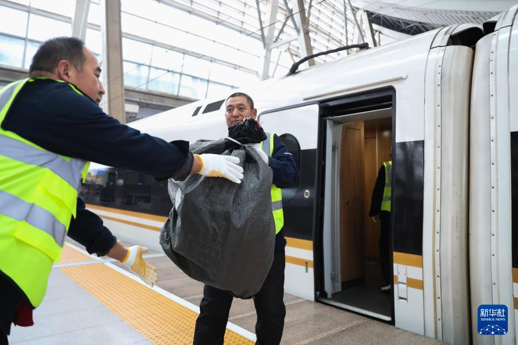 11月11日,工作人员在北京南站的一节快件预留车厢中进行卸车作业。