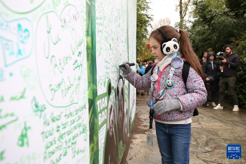 11月10日,在位于比利时布吕热莱特的天堂动物园,小朋友为大熊猫“天宝”“宝弟”和“宝妹”写下祝福。