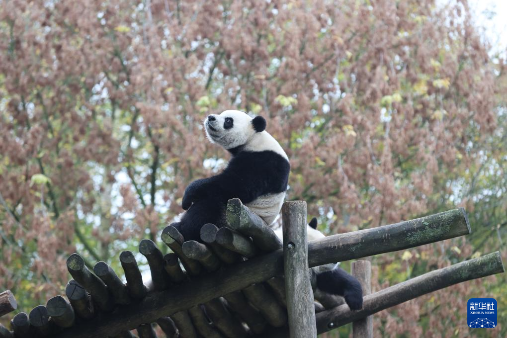 11月10日,在位于比利时布吕热莱特的天堂动物园,大熊猫“宝弟”(左)和“宝妹”在嬉戏。