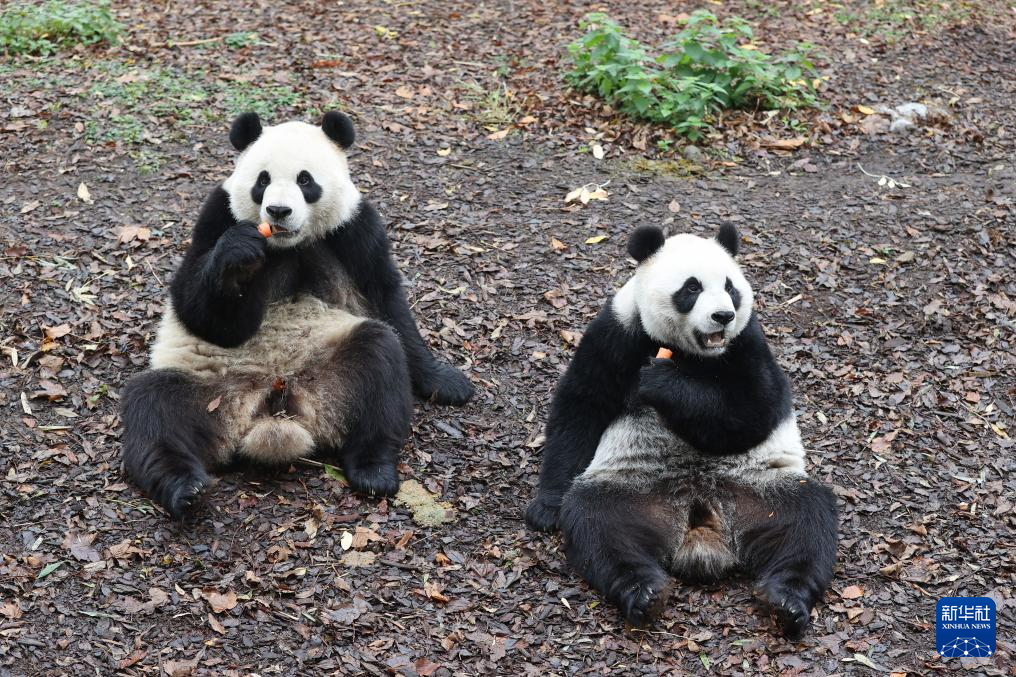 11月10日在位于比利时布吕热莱特的天堂动物园拍摄的大熊猫“宝弟”和“宝妹”(右)。