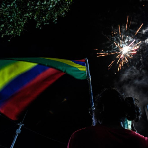 11月11日,在毛里求斯特里奥莱一处选票统计点外,“变革联盟”的支持者提前庆祝选举获胜。