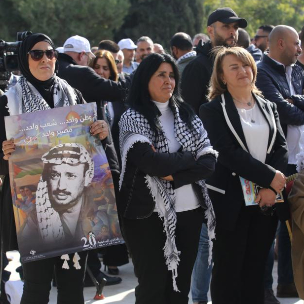 11月11日,在约旦河西岸城市拉姆安拉,民众集会纪念巴勒斯坦前领导人阿拉法特逝世20周年。