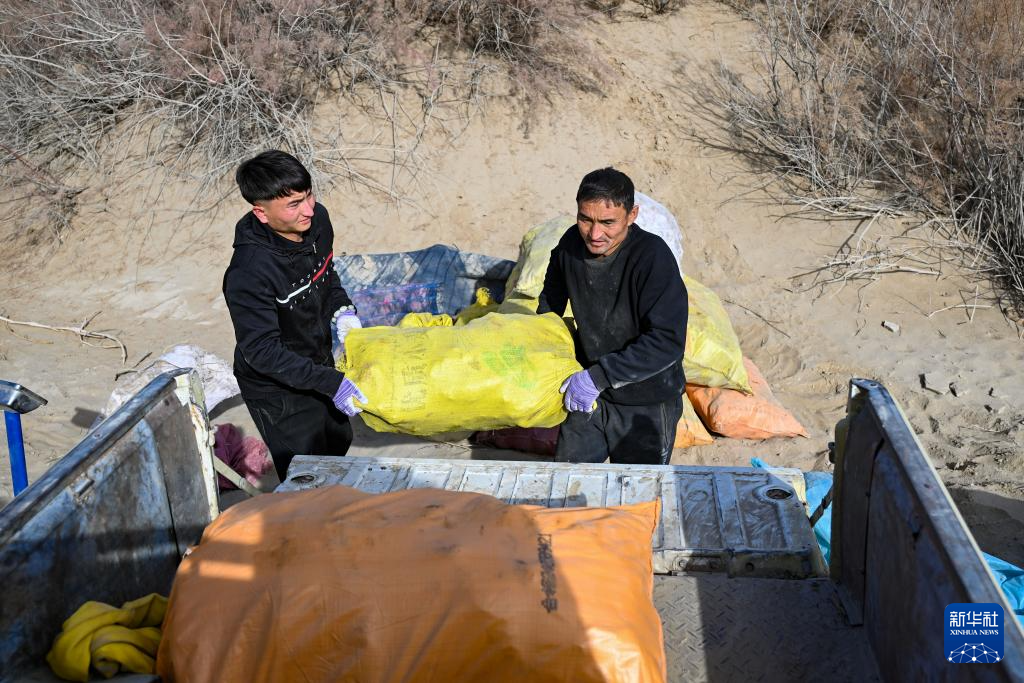 达里雅布依村村民阿不都热西提·买买提(右)与儿子一起搬运刚采摘的肉苁蓉(2024年11月6日摄)。