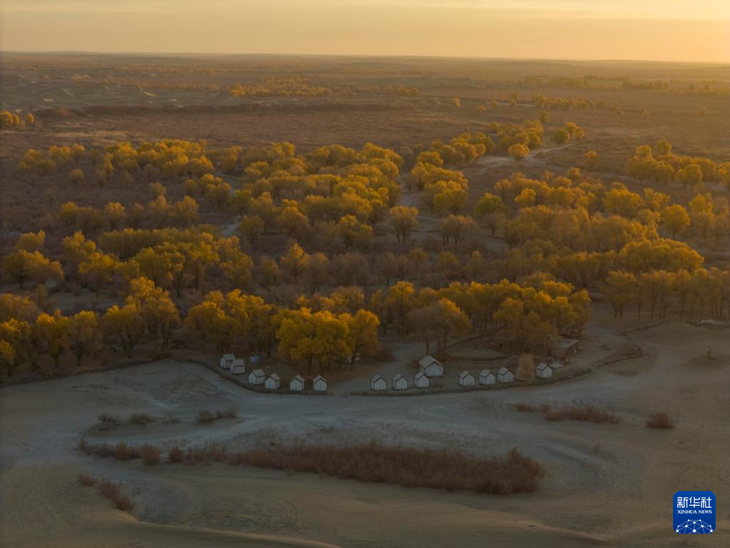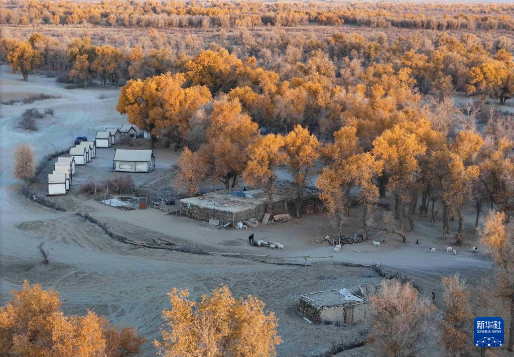 新疆于田县达里雅布依旧址景区内的民宿和胡杨林(2024年11月6日摄,无人机照片)。