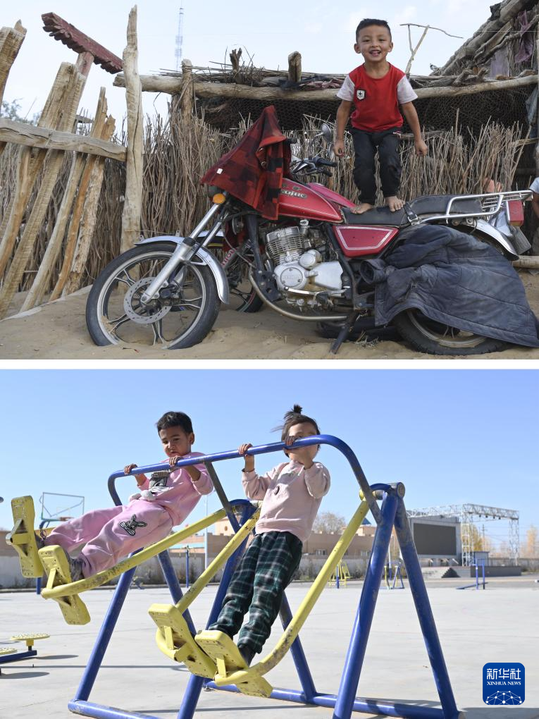 拼版照片:上图为搬迁前,达里雅布依村的小朋友在户外沙地玩耍(2018年9月6日摄);下图为小朋友在达里雅布依新村小广场上玩耍(2024年11月9日摄)。