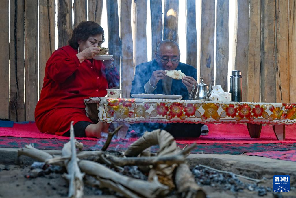 在新疆于田县达里雅布依新村一家农家乐内,游客在品尝新鲜出炉的特色食品“库麦其”(2024年11月9日摄)。