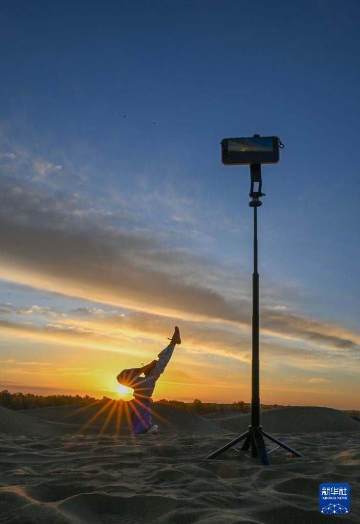 清晨日出时,游客在新疆于田县达里雅布依旧址景区的沙山上拍照(2024年11月6日摄)。