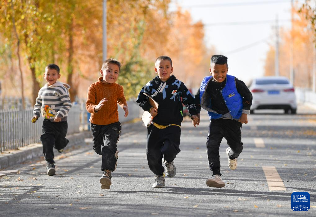 小朋友奔跑在新疆于田县达里雅布依新村(2024年11月9日摄)。