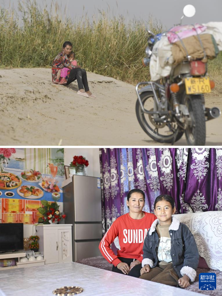 拼版照片:上图为搬迁前,一次外出归来,达里雅布依村村民比里刻自·如孜抱着女儿在路旁休息(2018年9月6日摄);下图为比里刻自(左)和女儿在新村家中休息(2024年11月9日摄)。